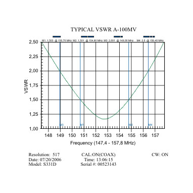 A-100 MV базовая omni (всенаправленная) антенна - одна из наиболее популярных базовых антенн диапазона VHF, что связано с ее весьма привлекательной стоимостью, простотой настройки и установки, и наряду с этим, очень высоким качеством исполнения. За счет более узкой, чем у полуволнового вибратора диаграммы направленности A-100 MV имеет более высокое усиление. Оптимальный узел согласования антенны обеспечивает низкое значение КСВ во всем диапазоне перестройки.