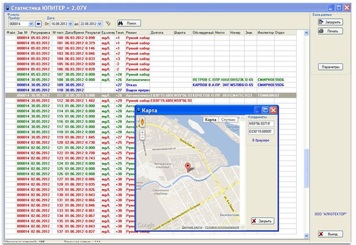 • GPS / ГЛОНАСС. Алкотектор Юпитер снабжен встроенным приемником системы позционирования (GPS или ГЛОНАСС) для определения координат места проведения измерения и автоматического внесения их в протокол измерения.