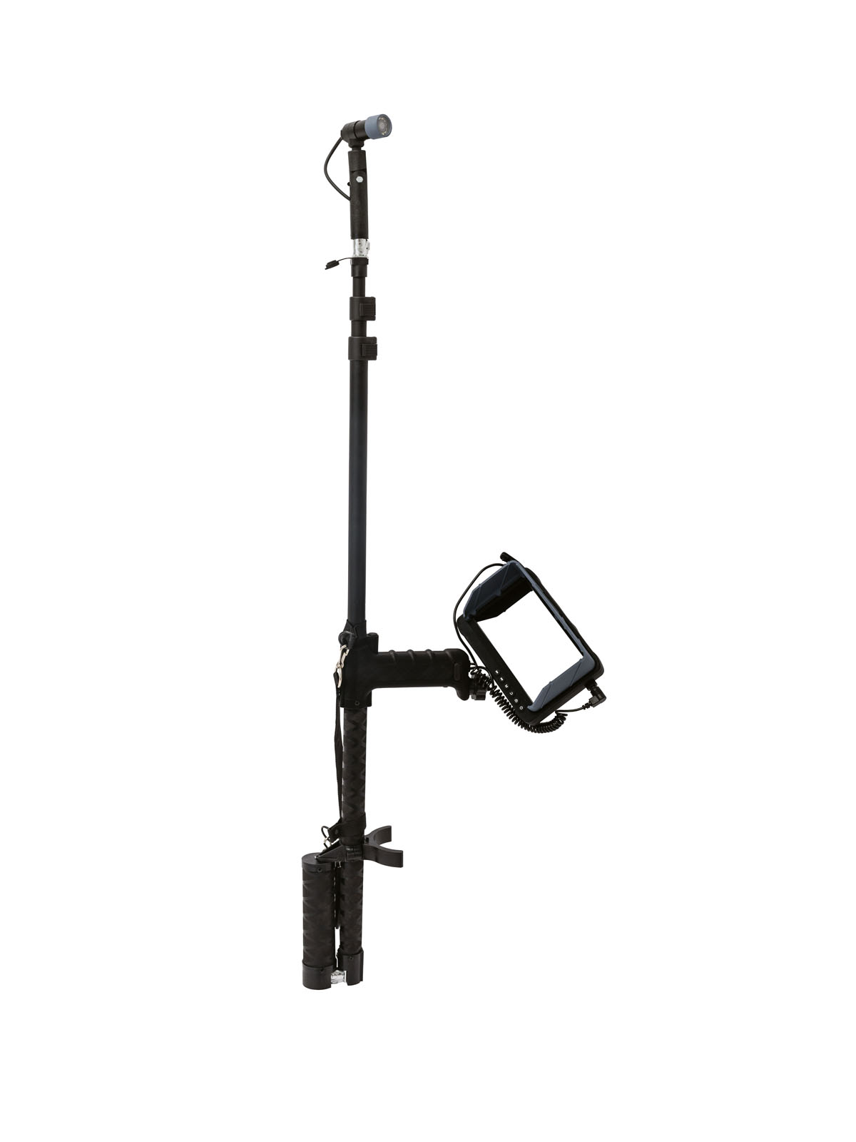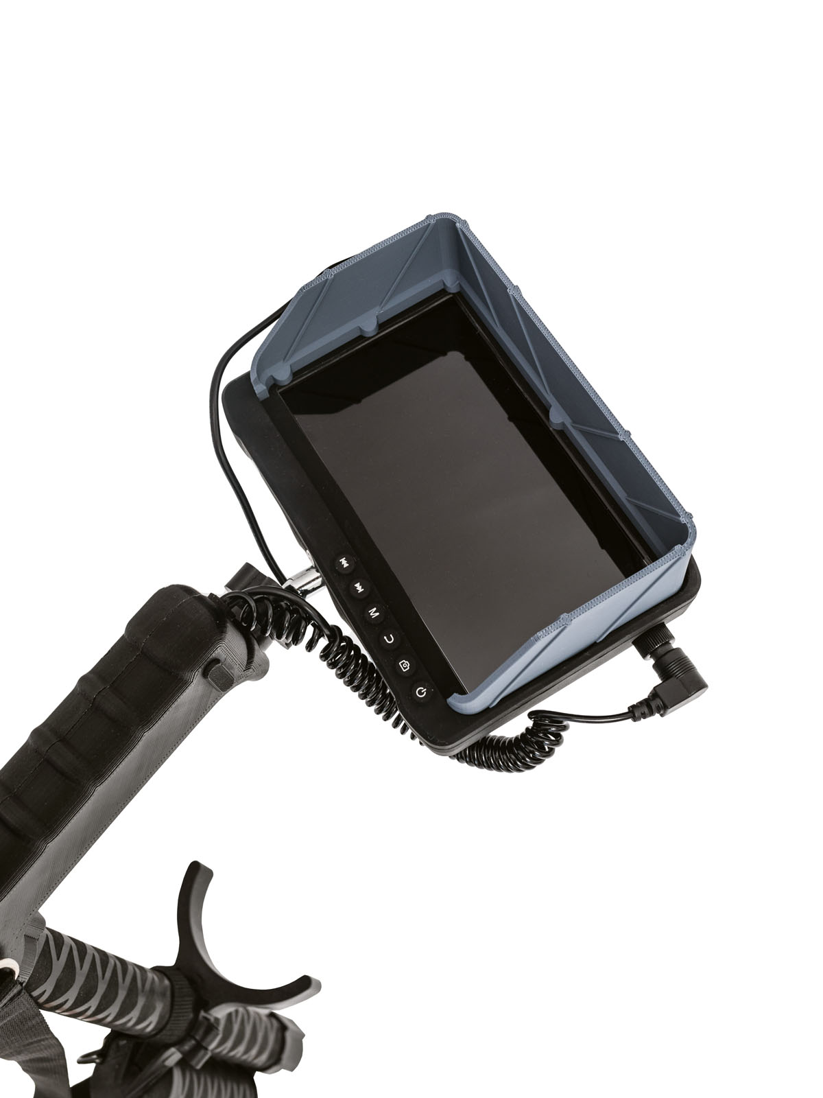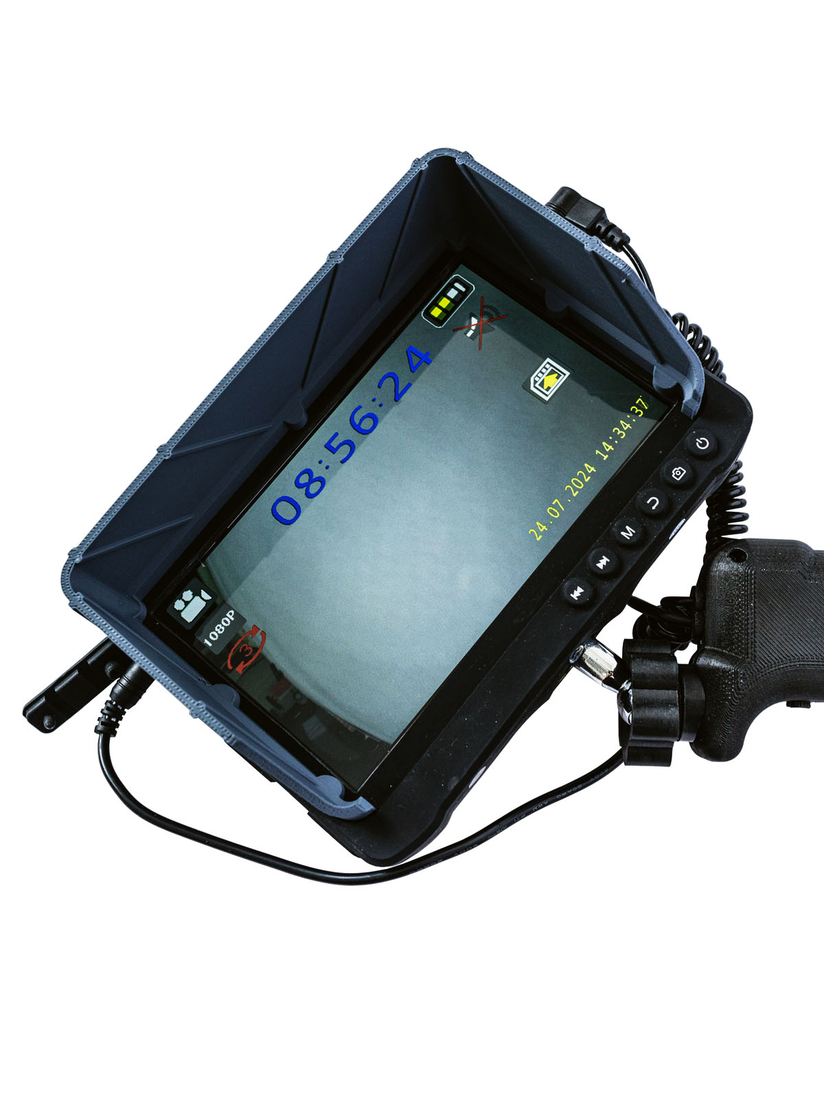 Видеодосмотровое устройство представляет собой разборную конструкцию с установленными на ней цветной видеокамерой с подсветкой из 12- ти светодиодов, цветным монитором с блоком управления. Эргономичная и легкая конструкция позволяет комфортно работать оператору длительное время.Напряжение питания подается от съемного Li-Pol (5600 мА/ч) аккумулятора (время непрерывной работы изделия до 10 часов).