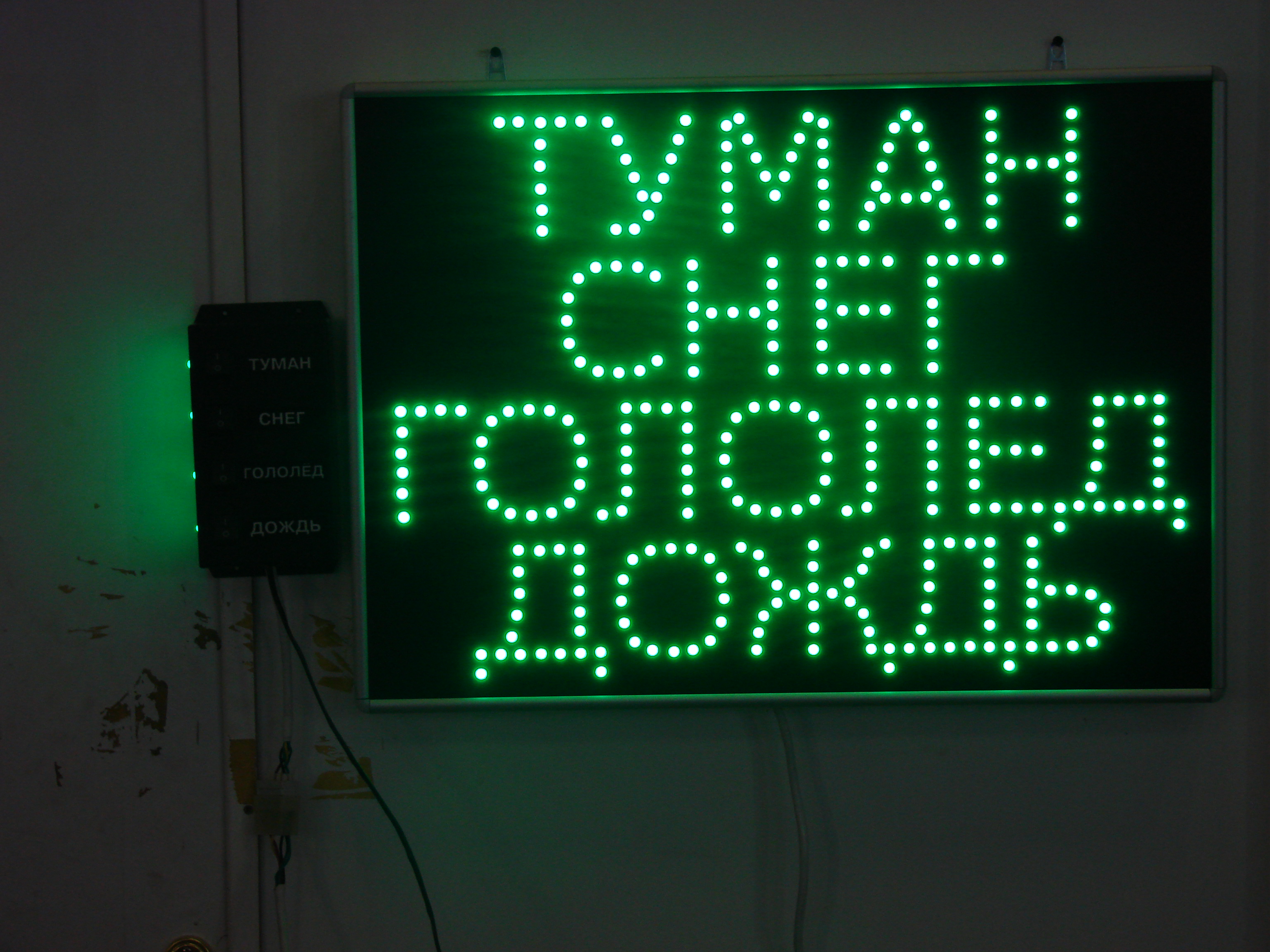 Световое табло "Туман, снег, гололед, дождь" - преднозначено для обозночения погодных условий, на автобазах и автотранспортных предприятиях. Подсветка выполнена из мощных светодиодов.