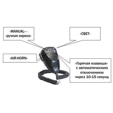 - Подачу сигналов сирены WAIL, YELP, HI-LO.