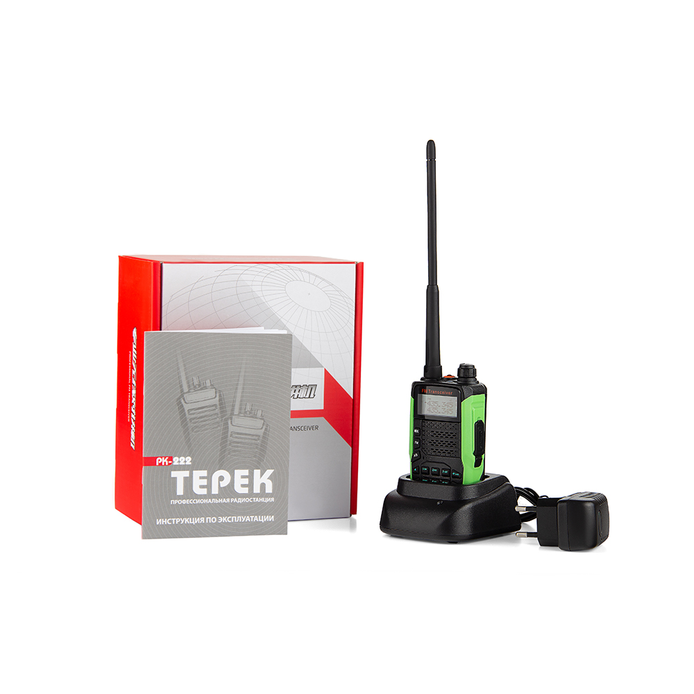 Современная UHF/VHF радиостанция, укомплектована литий-полимерной аккумуляторной батареей высокой ёмкости - 1850 мАч. Радиостанции ТЕРЕК РК-222 работает в двух диапазонах VHF 136-174 МГц и UHF 400-480 МГц. Выходная мощность 5 ватт.
