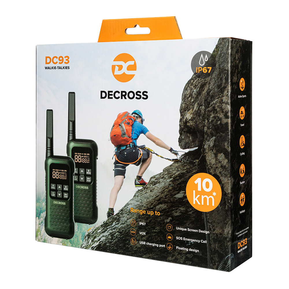 При падении в воду устройство всплывает на поверхность и автоматически активирует фонарик, что позволит без труда обнаружить его даже в темноте. DC93 оснащен уникальным инверсным LCD экраном, который увеличивает длительность работы устройства и снижает излучения дисплея. Рации можно заряжать через специальную зарядную подставку из комплекта поставки или напрямую через Micro USB порт. Модель отличается превосходной эргономикой и высокой надежностью.
