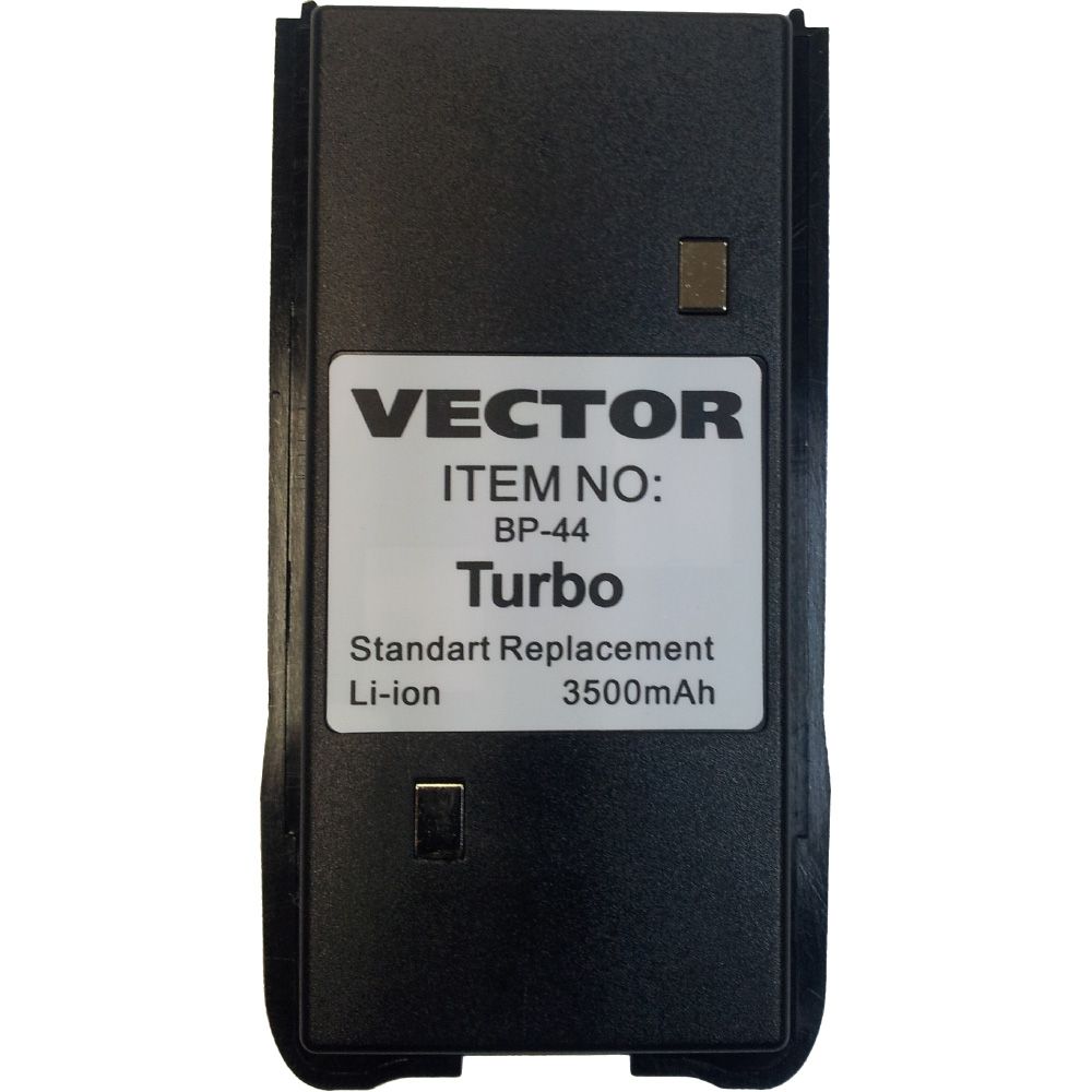 Радиостанция Vector VT-44 Turbo - портативная безлицензионная радиостанция, в которой увеличена дальность связи. АКБ Li-Ion увеличенной ёмкости 3500 mAh, напряжение 7,2B. Быстрое з/у "стакан", литое шасси, гарнитура. Диапазон LPD/PMR, частоты 433,075-434,755 и 446,00625-446,09375 MHz.
