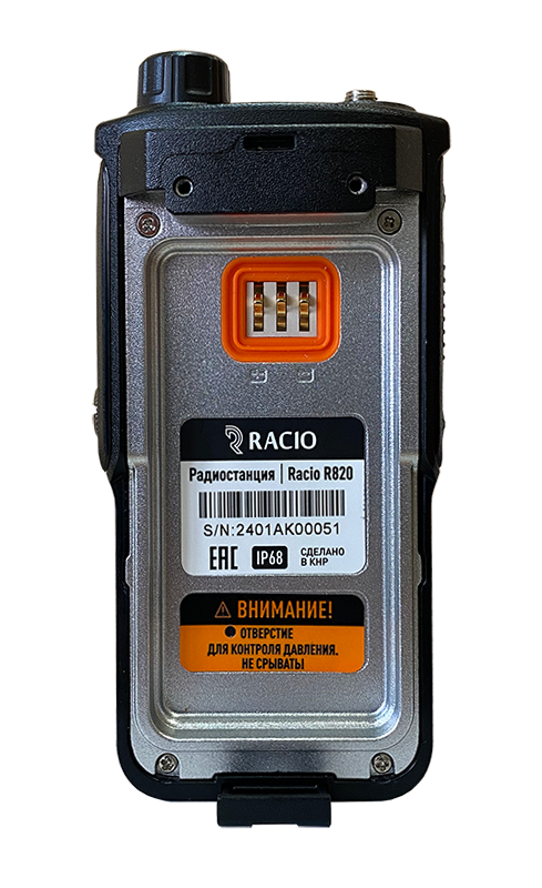 Корпус радиостанции Racio R820, выполненный из ударопрочного пластика, позволяет использовать рацию в самых сложных условиях, а класс пылевлагозащиты IP68 делает её надежным помощником в любых погодных условиях.