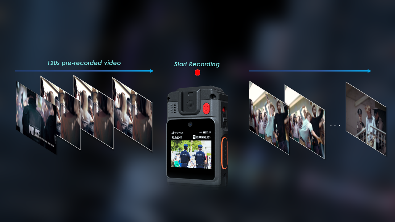 - Предварительная запись позволяет видеорегистратору автоматически записывать непрерывный цикл видео и аудио продолжительностью до 120 секунд, прежде чем запись будет активирована вручную. Это гарантирует, что важнейшие события будут запечатлены и записаны максимально полно – даже до нажатия кнопки записи, особенно когда события динамически развиваются.